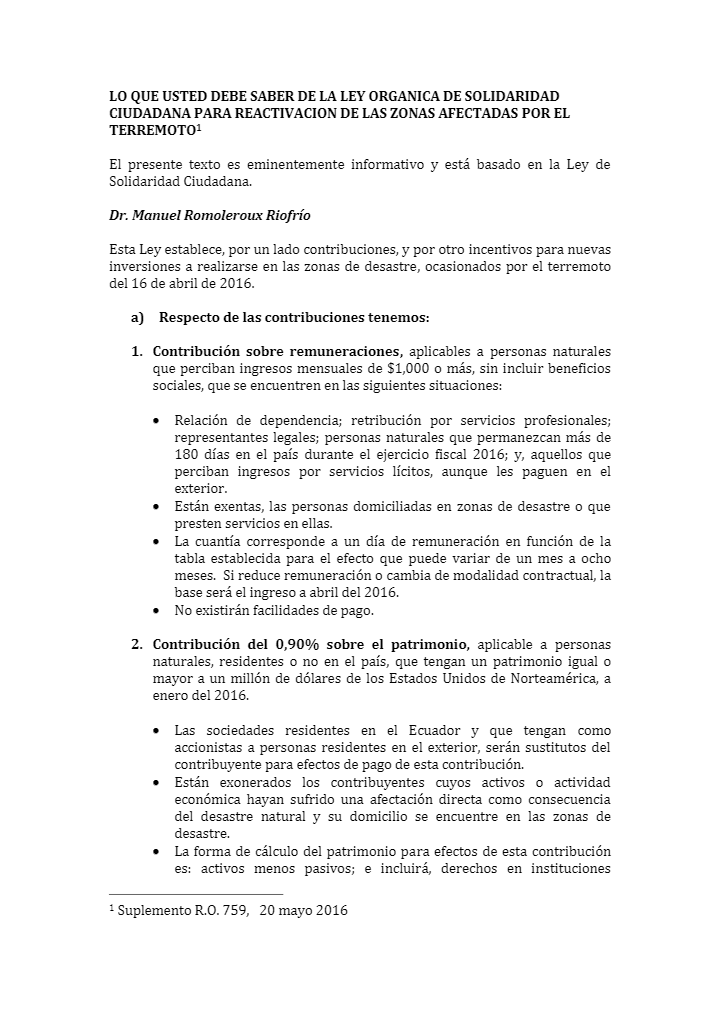 LO QUE USTED DEBE SABER DE LA LEY ORGANICA DE SOLIDARIDAD CIUDADANA PARA REACTIVACION DE LAS ZONAS AFECTADAS POR EL TERREMOTO